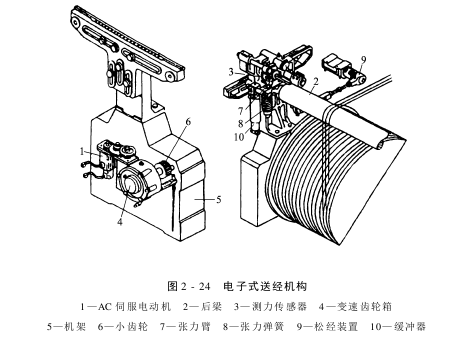 电子送经机构组成:电动机、减速装置、经纱张力探测装置、微机操纵部分和积极式松经装置。