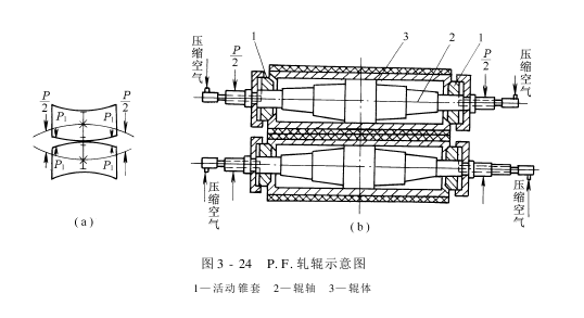 图3-24所示的P.F.轧辊,是由日本制造的。上、下轧辊为同一结构。一对中固轧辊,在加压后弯曲变形,形成线压力中间大、两端小的状况,如图3-24(a)所示。在辊体两端内侧各装一套附加加压装置,如图3-24(b)所示。它由安装在辊体两端内孔中的锥形套筒和可在辊轴上沿轴向滑移的锥形块组成。从辊轴轴头中心孔通入的压缩空气,能使锥形推块沿轴向向辊体内移动。其锥形面压向锥形套的内侧面产生一横向的附加压力,改变了辊体端部的变形。调节压缩空气的压力,就可调节横向矫正变形的附加压力,和轧压压力相适应。锥形推块和套筒的锥度不能大,否则,横向矫正就小;但也不能太小,因要产生自锁,一般取10°左右。
