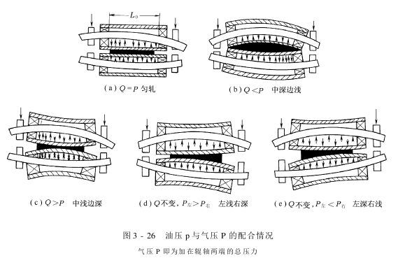 Küsters轧辊不仅能产生很好的匀轧效果,而且,通过调节内腔油压力p,可使辊体内壁承受的总压力改变,取得各种不匀轧效果,以适应各种非常工艺的要求,如图3-26所示。