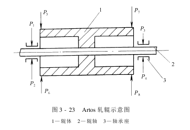 其实,这种轧辊的基本原理和Artos轧辊相似,都是通过加在辊体两端的反向力矩来平衡轧辊两端工作压力产生的弯矩,减小轧辊的变形。但P.F.轧辊的结构简单,操作和维修也方便。