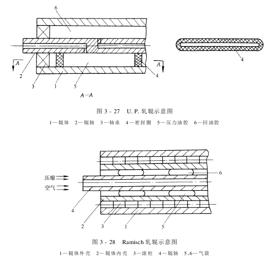 图3-25是德国Küsters轧辊的结构图。辊体安装在轴承上,绕固定不动的辊轴转动。辊轴和辊体之间的空腔,由端面密封条和轴向密封条分隔为两室。在轧点一侧的半环形空腔,称为压力室;在轧点另一侧的半环形空腔,称为泄油室。压力油由轴端上的进油孔进入压力室。泄漏入泄油室的油则经轴上的回油孔流回油箱。