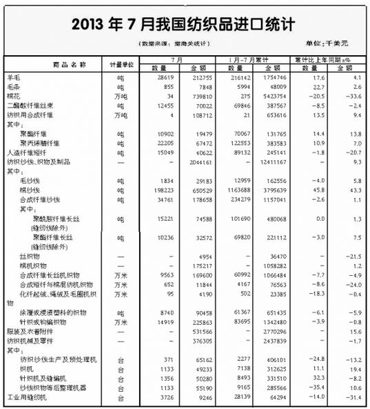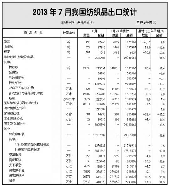 在内、外部环境的压力下,5~6月,全国纺织品服装出口一度呈现低速增长,平均增幅只有5.2%。7月,受国务院出台的贸易便利化措施和一系列利好政策的预期效应推动,企业出口信心有所增强。同时,外部市场需求略有回暖,使我国前期低迷的出口呈现出恢复性增长。再加上7月份人民币币值相对稳定,上述几个因素共同促成当月纺织品服装出口实现15.8%的较快增长。