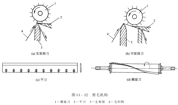 剪毛机的主要部分是剪毛机构,它由螺旋刀、平刀及支呢架三部分组成,如图11-12所示。