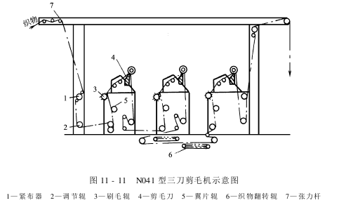 图11-11所示为N041型三刀剪毛机示意图,它主要由进出布装置、三组剪毛机构、