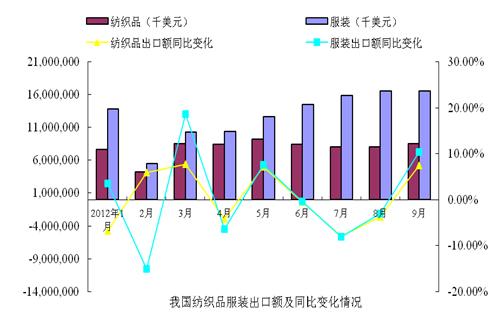 2012年9月,我国纺织品服装出口额为251.26亿美元,环比增长2.14%,同比增长9.33%。其中,纺织品(包括纺织纱线、织物及制品)出口额为85.41亿美元,同比增长7.47%;服装(包括服装及衣着附件)出口额为165.84亿美元,同比增长10.32%。