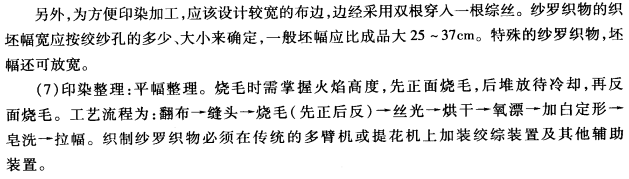 (3)装饰用中厚型纱罗织物:用16.9tex×4(35英文×4)聚丙烯腈纤维纺纱线或相应特数的毛型粘胶丝、合纤长丝等,织物丰厚柔软,富有仿毛风格或仿绸风格。